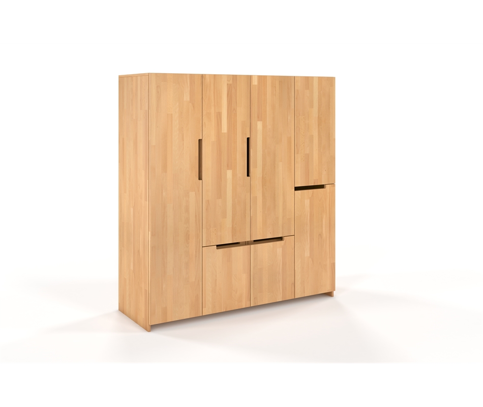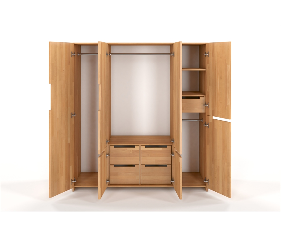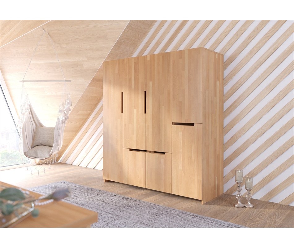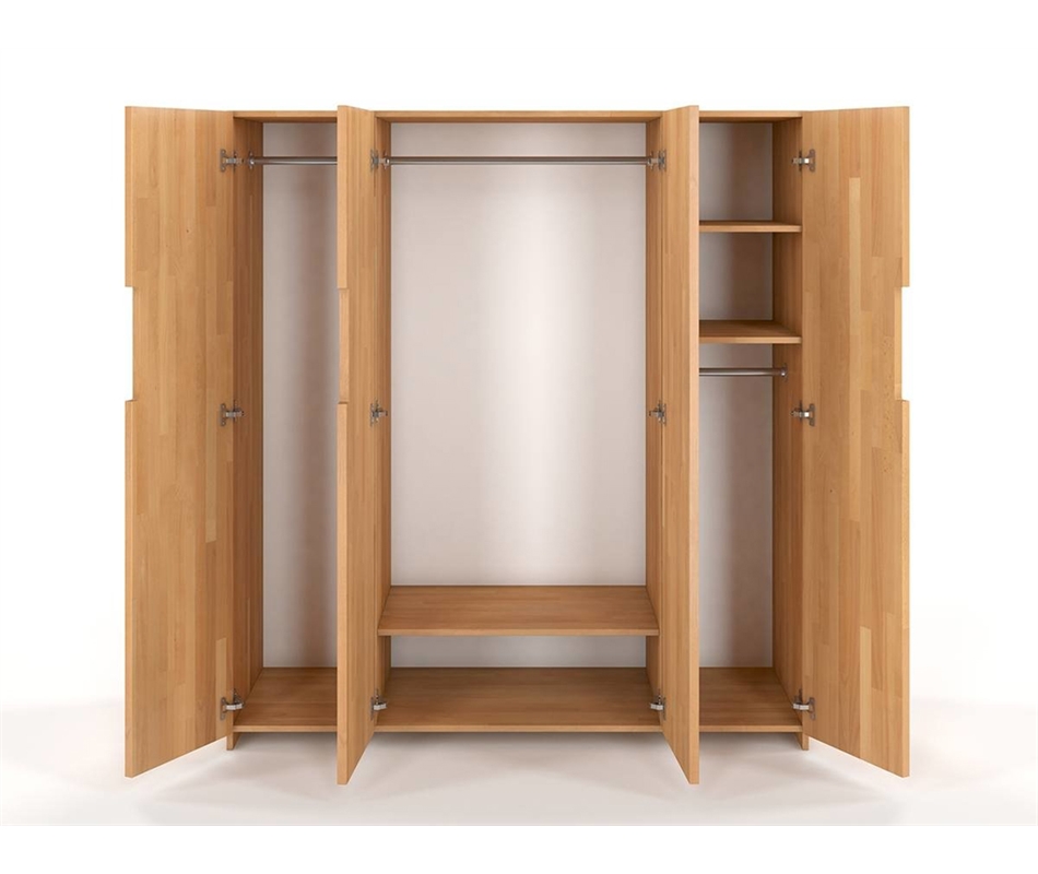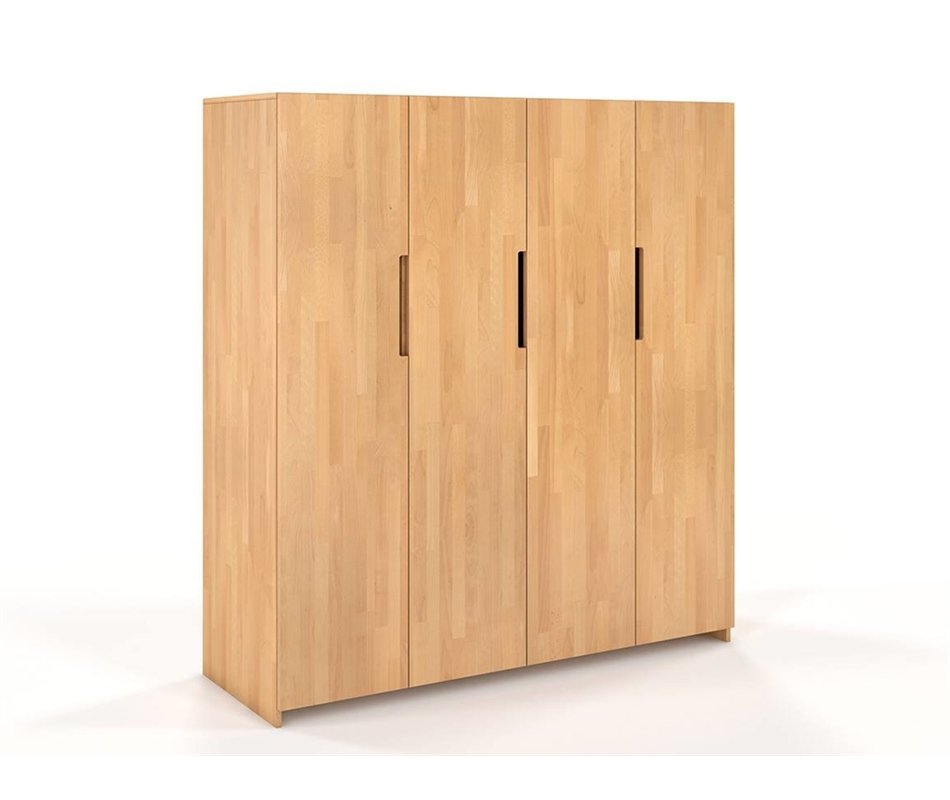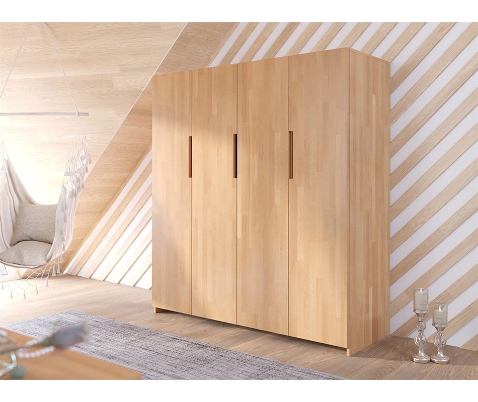 Armadio in lamellare di faggio massiccio . Altezza 180 cm, larghezza 170 cm, profondità 60 cm. La tecnica del lamellare permette di eliminare nodi ed impurità, creando un prodotto dall'aspetto quanto più possibile omogeneo e uniforme. Il legno lamellare con giuntura a pettine inoltre offre una maggiore resistenza ai danni e tende a non deformarsi per le variazioni di umidità nell'ambiente. Nella versione con quattro ante c'è uno spazio diviso in tre parti con tre barre e tre ripiani. Nella vers...