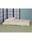 Futon formato da 3 strati di cotone 100% naturale. Altezza 8/9 cm. Rivestimento certificato in cotone BIO 80/Canapa Bio 20. Cerniera d'ispezione. Indicato per l'uso come materasso per bambini. Il tatami e i cuscini non sono compresi nel prezzo.