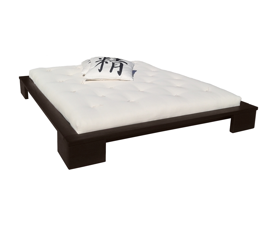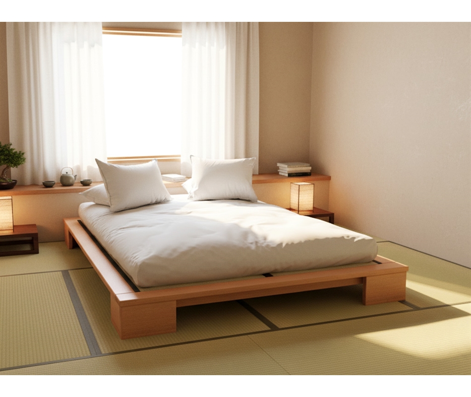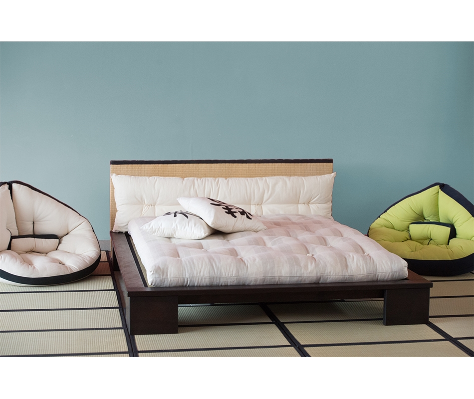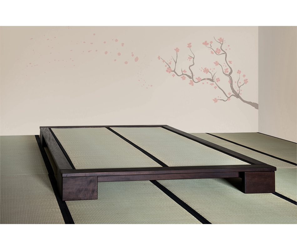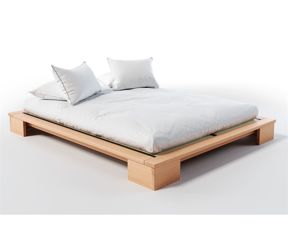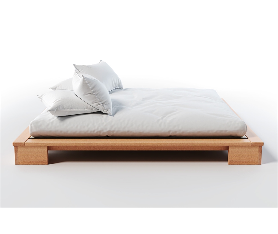 Letto in legno Fujiko in okumè massello completamente ad incastro, senza viti e parti metalliche.