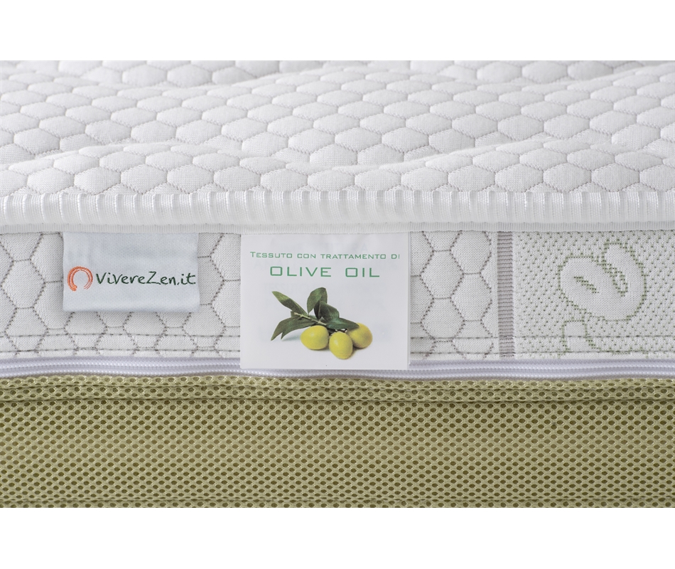 Fodera trattata in un bagno di essenza all'olio di oliva, che conferisce al tessuto proprietà antiossidanti e antibatteriche, e influisce positivamente sulla rigenerazione cellulare. Grammatura 300 gr/mq. Imbottitura in tessuto anallergico.