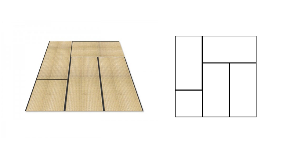 4 tatami 100x200 e 1 tatami 100x100 coprono una superficie di 300x300 cm, e il bordo nero delle stuoie di paglia di riso, consente di creare disegni che richiamano il tipico stile delle case orientali.