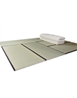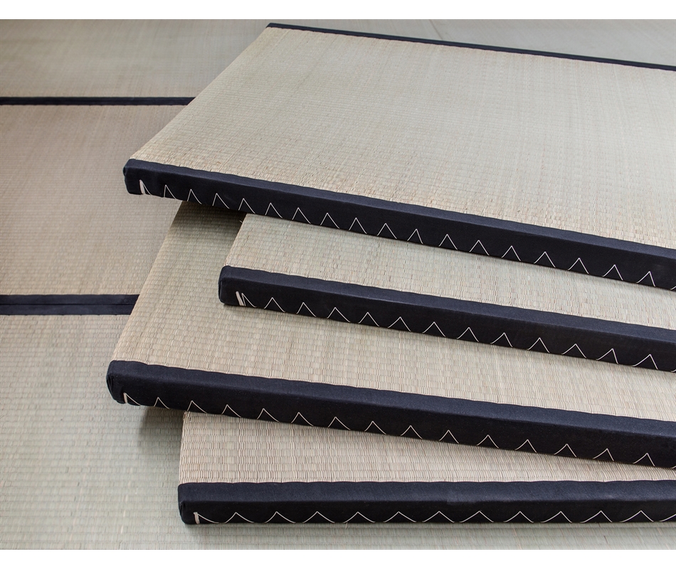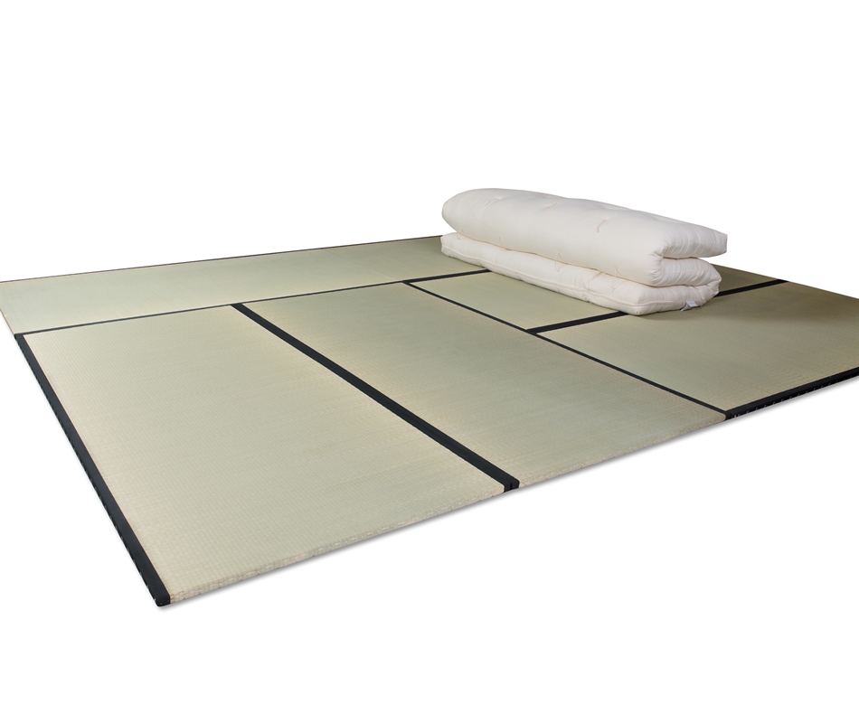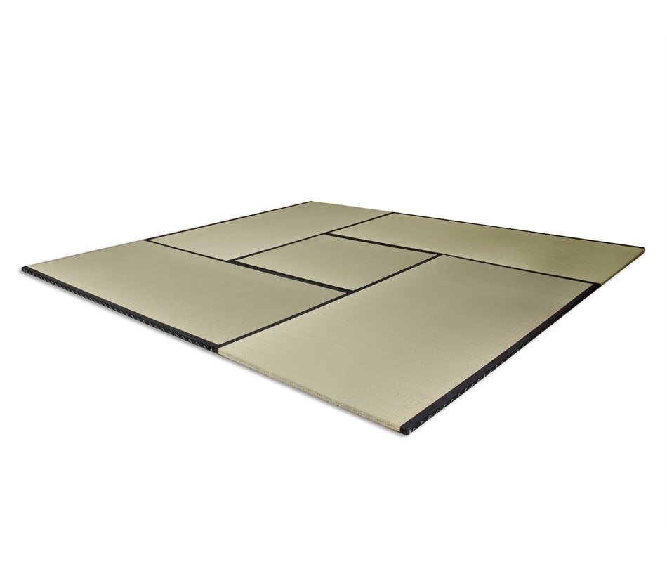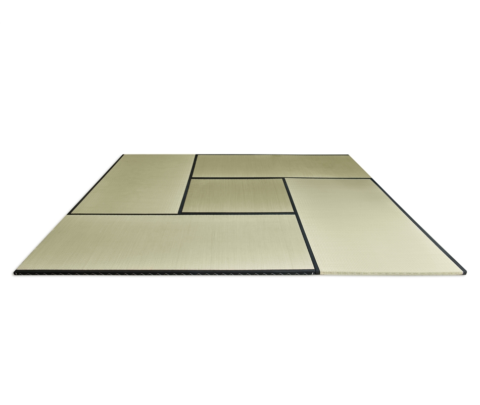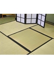 4 tatami 100x200 e 1 tatami 100x100 coprono una superficie di 300x300 cm, e il bordo nero delle stuoie di paglia di riso, consente di creare disegni che richiamano il tipico stile delle case orientali. I tatami tradizionali sono così composti: interno in paglia di riso pressata e rivestimento di giunco intrecciato. Nelle classiche abitazioni nipponiche vengono adoperati per la pavimentazione delle stanze. Possono essere usati come base per il futon o un materasso tradizionale (non in lattice...
