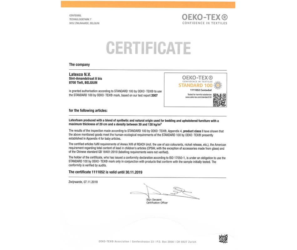 I materassi in lattice a marchio Latexco vantano di utilizzare esclusivamente lattice naturale derivato da piantagioni controllate e certificate ISO (ISO14001) che rispondono agli standard di qualità più rigorosi. I materassi in lattice della Latexco hanno le certificazioni ecologiche Öko-Tex Standard 100 e Eurolatex, la certificazione di qualità LGA, nonché il marchio comunitario di qualità ecologica, Ecolabel (2002/740/EU).